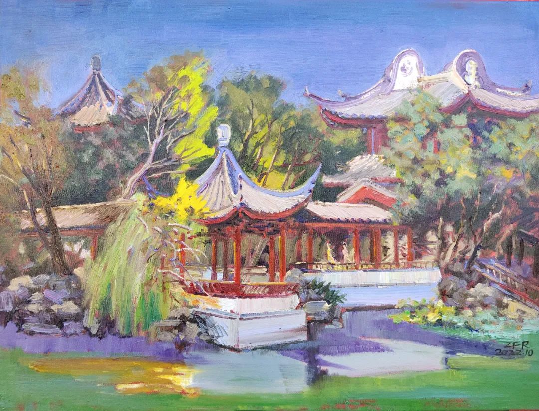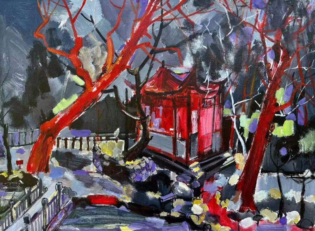 张法然《梅湖个山园》布面油画